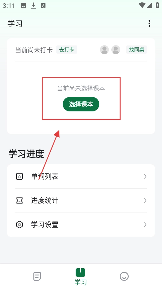 在学习页面,要是还没选定课本,就点击【选择课本】按钮,进入课本选择界面选择合适的课本。