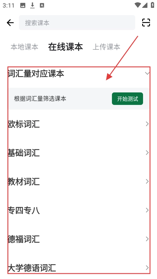 进入课本选择界面后,你会看到【词汇量对应课本】【欧标词汇】等不同分类,可依据自身需求直接选择课本,或者通过测试来筛选合适的课本。