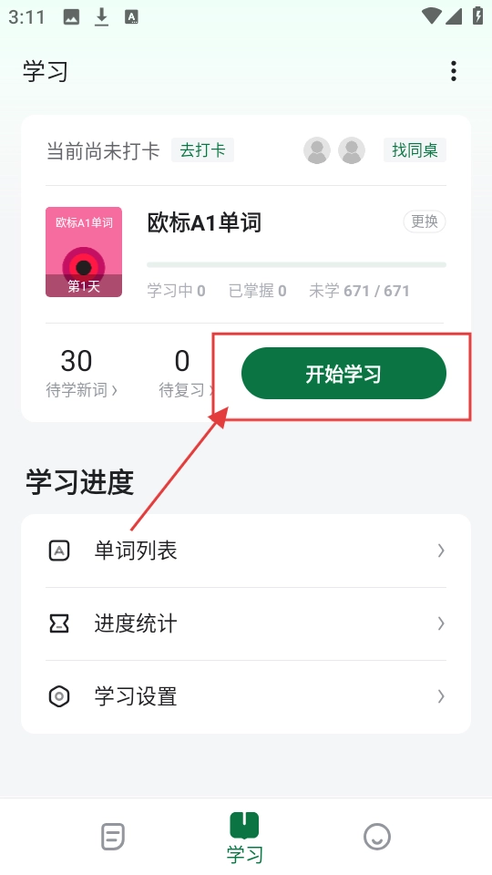 选好课本后,返回学习页面,点击【开始学习】按钮,就能进入单词学习界面开始学习。