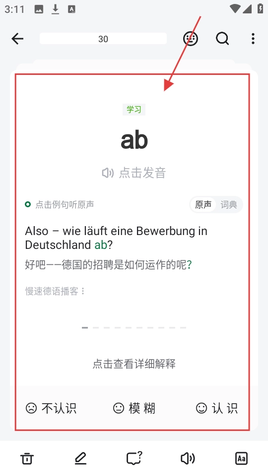 在单词学习界面,你可以看到单词本身、对应的发音以及例句等内容,既能够依照界面给出的提示进行学习,也可以对单词的熟悉程度进行标记。