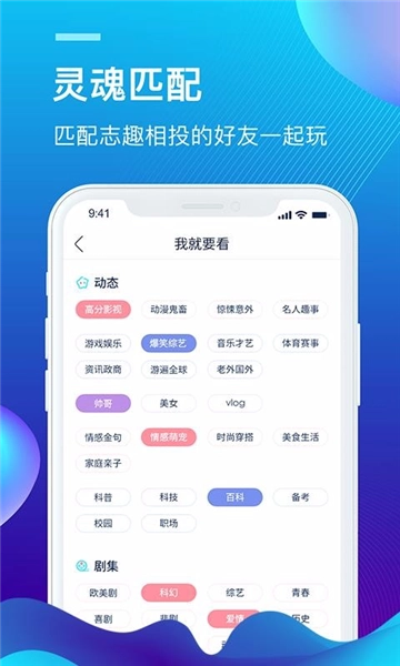 6、用户可以选择自己的兴趣,方便系统推荐一样的视频、用户、剧集;