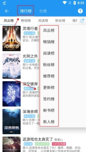2、随后会弹出诸多选项,第一种搜索方式是在排行榜中进行选择,榜单类型丰富,像风云榜、畅销榜、阅读榜等都包含在内。