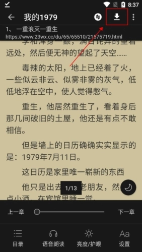 2、接着会进入阅读界面,若需要缓存,就能看到右上角【】的按钮,点击该按钮即可。