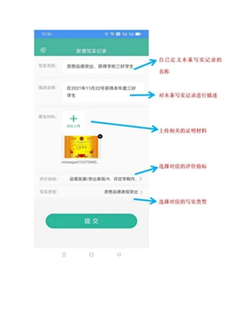 5、在写实记录页面填写本条记录的相关说明并上传材料,随后点击提交按钮