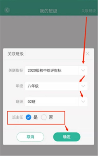 3、点击关联班级-选择自己所带的年级-班级-如果是该班班主任-点击是-如果不是则点否-点击确定。(一个班级只能设置一个班主任)