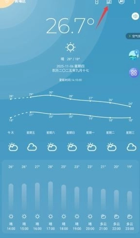 2、进入主界面后,点击顶部城市名称区域进入天气管理页面。