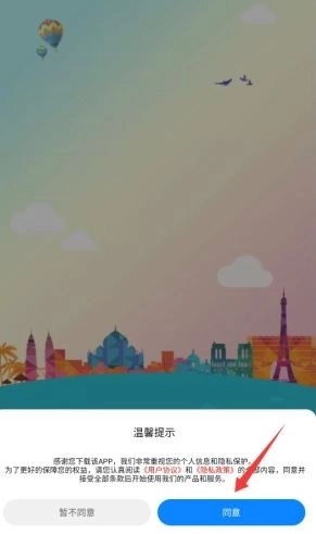 1、首次启动应用时,系统会显示用户协议和隐私政策,阅读后点击同意按钮进入主界面。