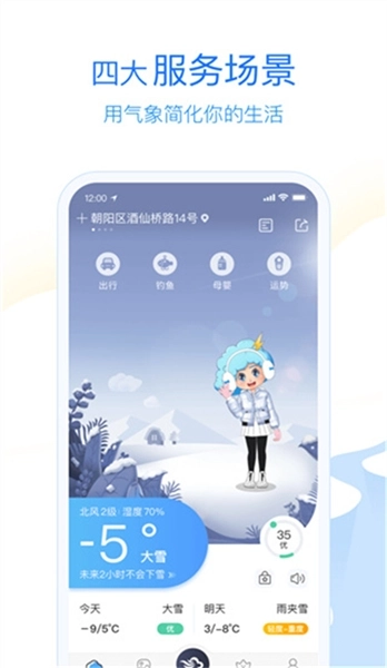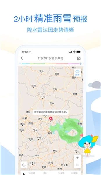 在原有的2小时短时预报基础上,新增加了48小时的精准雨雪预报,时间精度可达分钟级;同时还新增了温度、风力、气压的可视化地图,天气变化情况能够清晰直观地呈现。