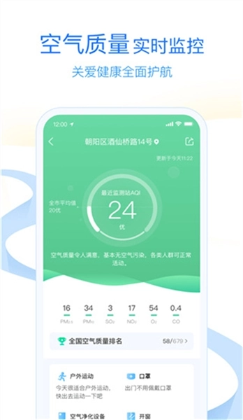 3、空气质量实时报告,涵盖PM2.5、PM10在内的六项污染物监测数据,同时提供全国空气质量排行功能,方便查看所在城市的空气排名情况。