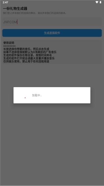 《一份礼物生成器》是一款带点搞笑和恶趣味的恶搞软件。在朋友的特别日子里,把它发给对方,对方的手机就会自动播放o泡果奶之类的搞笑音乐。这款软件很安全,不会窃取用户信息,安装包也不会报毒,还能推荐给好友一起玩恶搞!这里有超多语音素材可以选,大家能更好地恶搞好友,比如让“给我o泡”的音频一直重复,特别有趣,快来试试吧!