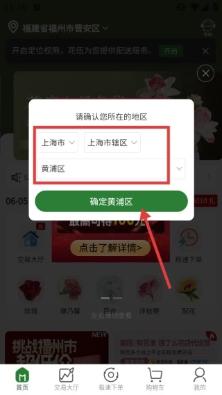 在地区确认弹窗中,选择你所在的地区,然后点击【确定黄浦区】按钮,以此来完成配送地区的设置。