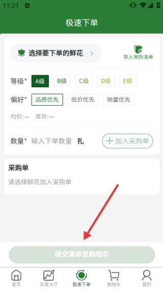 在快速下单界面,挑选鲜花的品质等级、个人喜好类型和所需数量,点击【将选品清单提交到购物车】按钮,即可完成下单前的准备工作。
