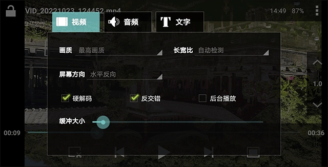 接下来,在播放器里,我们就能对画面质量、画面色度、长宽比、缓冲大小、元数据编码、屏幕旋转、seek间隔、文件缓存、后台播放、自动下一个、硬解码、反交错、码流自适应这些选项进行设置了。