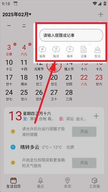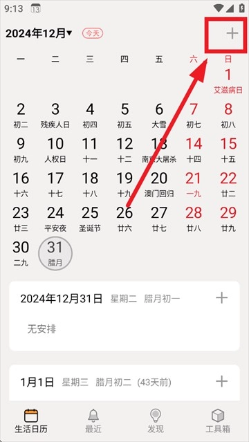 安装并安装生活日历,点击右上角"+"