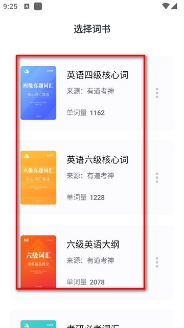 进入软件后,用户可根据需求选择想要背诵的词书,其中涵盖了四级、六级、考研等不同类别的词汇。
