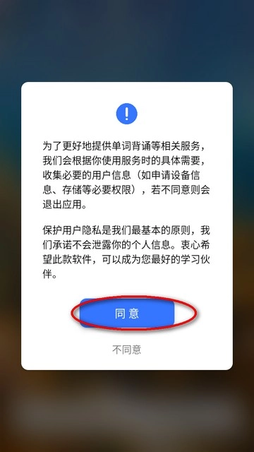 在本站完成单词记忆应用的安装后,打开该应用程序,在正式使用各项功能前,请先阅读并同意用户隐私政策条款。