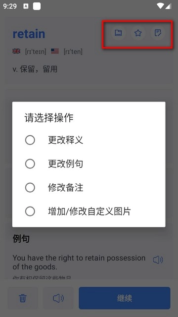 在单词展示页面的右上角区域,用户能够对该单词的词义解释、示例语句、备注信息进行调整,还可以自行添加或更换相关图片。