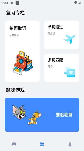 用户能够使用拍照取词、单词速过、多词匹配等功能,进行复习专栏和学习内容的相关操作。