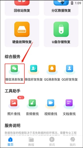 在这里软件,安装打开之后选择“微信消息恢复”。