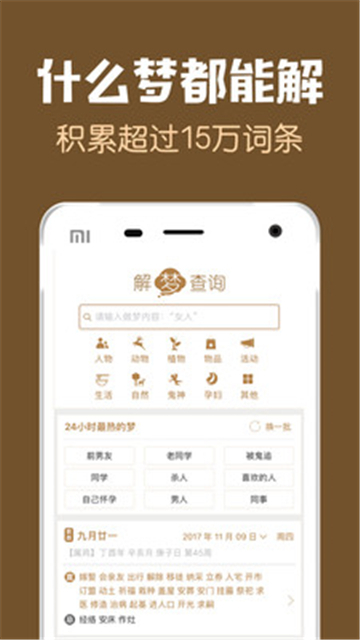 像梦到蛇、梦见怀孕、梦到死人、梦见拣钱、梦到考试、梦到做爱这类梦境,只要输入对应的关键字,就能轻松获取解梦答案。
