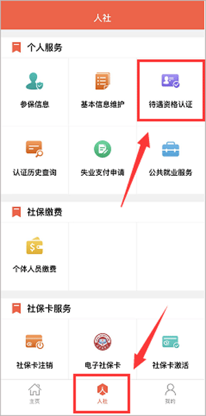 成功安装并登录“菏泽人社”手机应用后,在“人社”界面选择“待遇资格认证”。