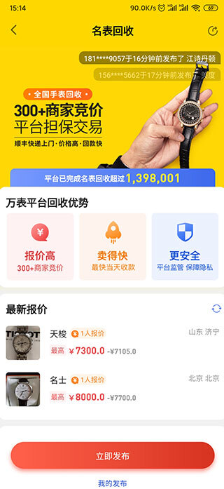 接着就能看到首页、买表、发布回收、视频看表、我的这五个板块,首页里包含二手表库、每日竞拍、价格行情、鉴定培训,还有形形色色的名表。