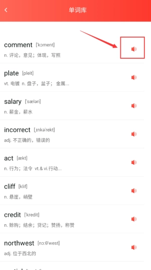 点击红框喇叭图标,听取单词标准发音示范。
