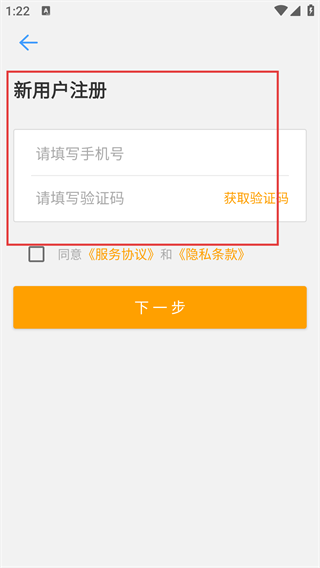 在新用户注册页面,首先输入【手机号码】,点击【获取验证码】按钮并填写收到的验证码,接着勾选同意相关协议,然后点击【下一步】按钮。