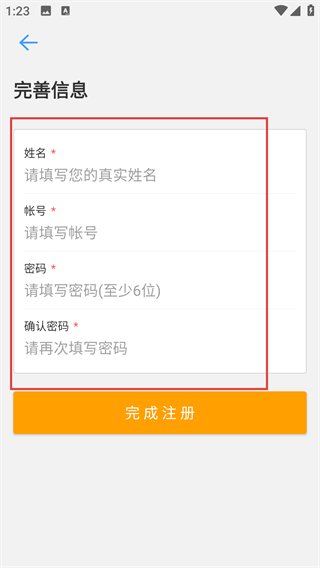 进入完善信息页面后,需要填写【姓名】【账号】【密码】(密码长度至少6位)以及【确认密码】,待所有信息填写完毕,点击【完成注册】按钮,就能结束整个注册流程。