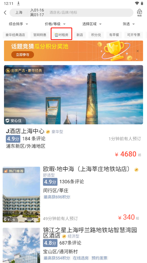 这里为用户提供了十分丰富的酒店类型,像经典酒店、特惠酒店、时租房(也就是钟点房)等。我们只需点击时租房选项即可。