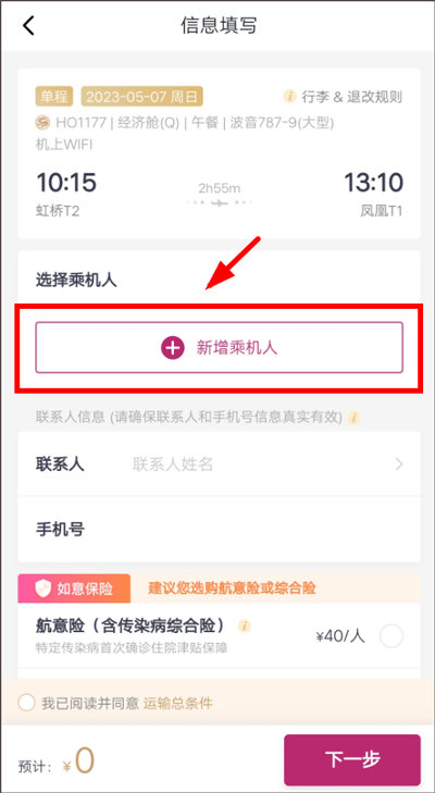 接着填写乘机人的相关信息,等信息都填写完毕后,点击【下一步】按钮,完成付款操作就能购买成功了。