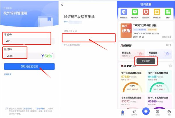 若为首次登录,会直接跳转至登录页面,此时选择【验证码登录】方式,使用管理员注册时绑定的手机号来登录。操作步骤如下:先填写对应的手机号,接着在验证码输入框处,勾选“阅读并同意《用户协议》、《隐私政策》”,然后点击【获取短信验证码】按钮;待手机收到验证码后,将其准确填写到验证码输入框内,即可完成登录并进入首页。
