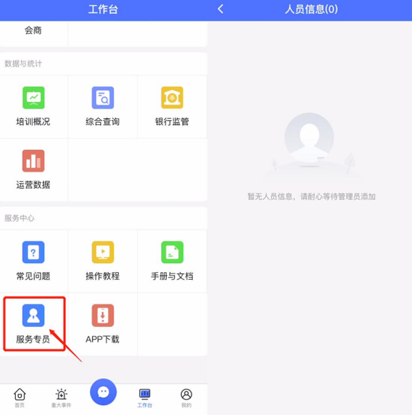 当出现这种情况时,只能查询到未通过的原因,无法直接处理。此时需要点击【服务专员】按钮,跳转至服务专员信息页面。管理员可在此查看对应区域的服务专员及其联系电话,通过电话咨询相关问题以推进处理。