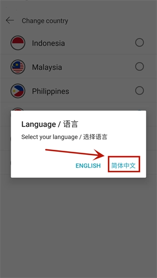 3、轻点国旗图标,把地区设定为新加坡,接着点击“continue”,随后在弹出的对话框里选择简体中文,如此便设置成功。