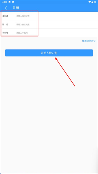 进入注册页面后,按照顺序填写身份证号码、真实姓名和手机号码,接着点击“开始人脸识别”按钮完成身份验证,这样就能完成账号注册了。