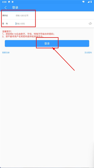 若您已有账号,可在登录页面输入身份证号与密码,随后点击“登录”按钮,即可完成账号登录操作。