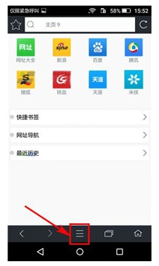 打开米侠浏览器后,点击页面下方中间位置的【三横】图标,具体位置可参考图示。