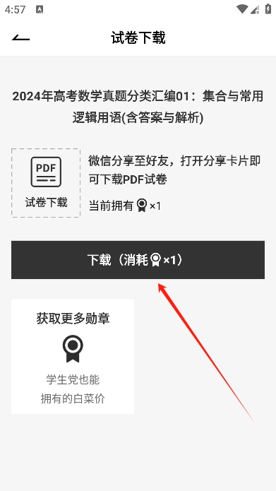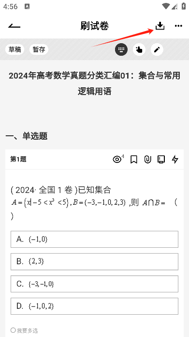 进入试卷页面后找到并点击右上方的图标。