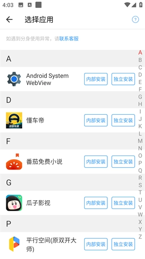 选择应用程序:在弹出的列表里挑选你希望创建分身的软件,然后选择点击内部安装或者独立安装,像微信、游戏这类都可以。