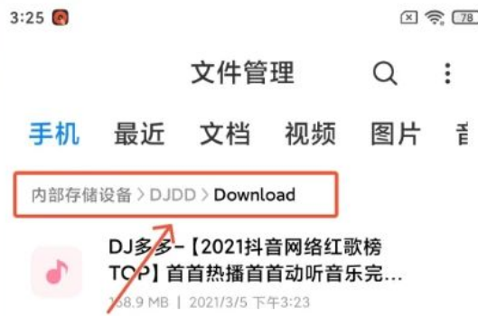dj多多的歌曲存放在Download文件夹里,详细的文件路径为内存存储设备/DJDD/Download