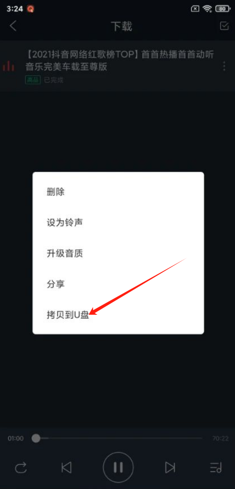 在“我的”页面中,找到目标歌曲后点击其右侧的更多按钮,接着选择“拷贝到U盘”选项即可完成操作。