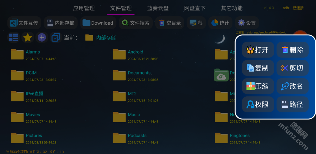 可以对根目录、TF卡以及U盘内的文件进行管理,像复制、剪切、解压这类操作都能实现,要是拥有root权限,还能使用更多功能。