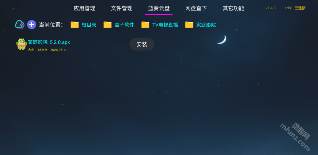 应用管家TV版具备蓝奏云网盘登录功能,用户可直接安装网盘中存储的文件,该功能有效拓宽了应用获取渠道,同时也为用户管理应用提供了便利。