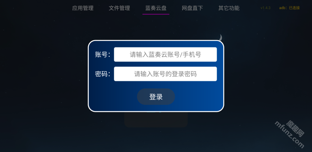 这个工具具备登录个人蓝奏云网盘的功能,能直接安装网盘内的文件,但用户得先把文件存到蓝奏云网盘里才行。