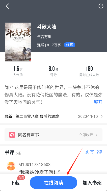 小说阅读操作步骤:找到您想阅读的小说并进入其详情页面,接着点击“在线阅读”按钮即可。