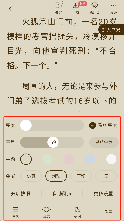 阅读界面设有字体大小、背景颜色、翻页方式等多种可调整的设置项,用户能依据自身喜好进行个性化配置。