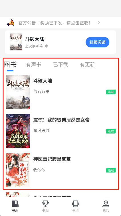 书架管理:阅读结束后,您能够把小说添加至书架当中,书架页面会展示出您添加过的所有小说,便于进行管理。