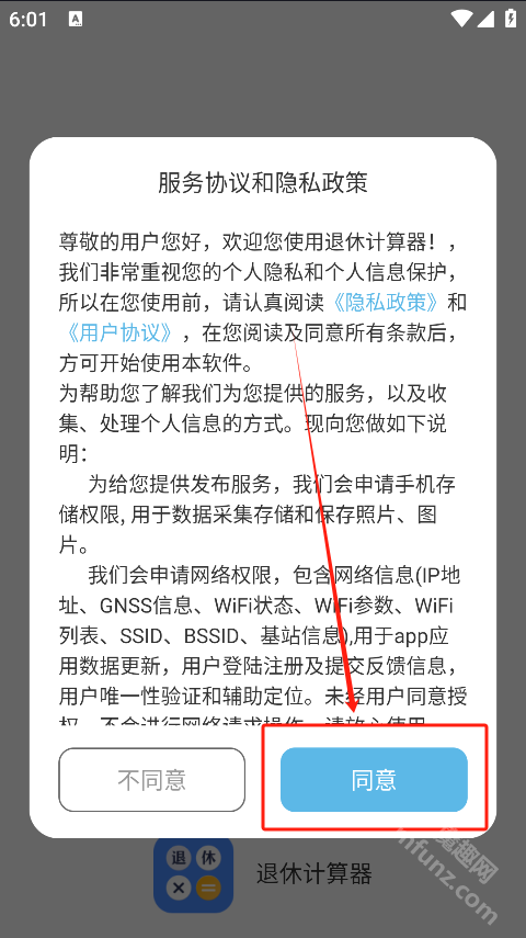 首先前往魔趣网下载并安装退休计算器应用。进入软件时点击“同意”按钮即可。