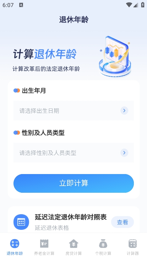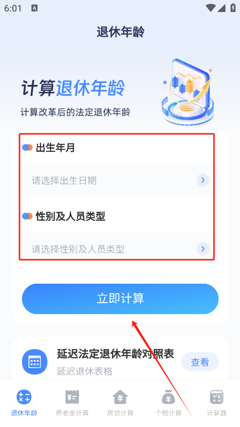 在首页的输入框中填写出生年月、性别和人员类型,接着点击“立即计算”按钮,即可获取退休时间与退休年龄。