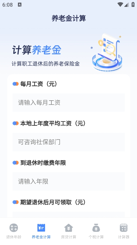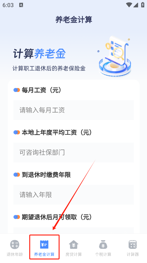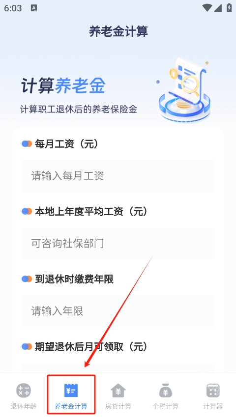 点击首页下方的“养老金计算”功能入口,输入工资水平、缴费年限等相关信息,就能立即为您测算出退休后的养老金金额。